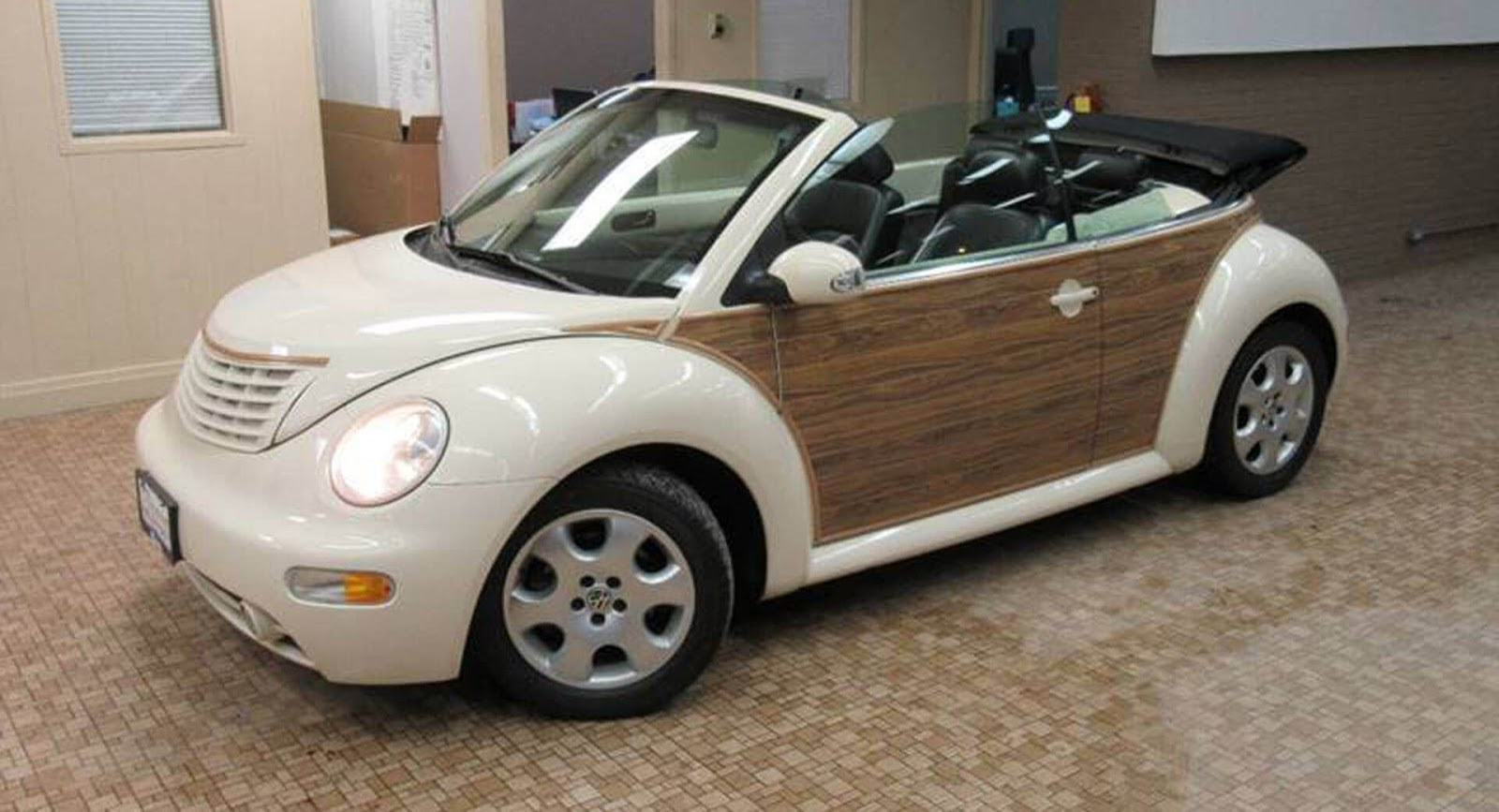 The eBay listing of this 2003 VW Beetle suggests that the car is the rare “Woody Edition” but in reality, it is just a horrific cream-colored Beetle convertible with styling inspired by the Chrysler PT Cruiser, an ugly vehicle in its own right.