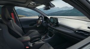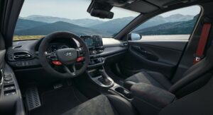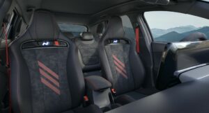 Hyundai’s upgrades continue into the cabin of the i30 N Drive-N Limited Edition and include Alcantara on the steering wheel, gear lever, armrest, and handbrake, as opposed to leather like all other i30 N models. Additionally, the standard Performance Blue accents have been replaced with red trimmings, including the N buttons on the steering wheel as well as the inserts and stitching on the seats. Exclusive floor mats have also been developed for the car.